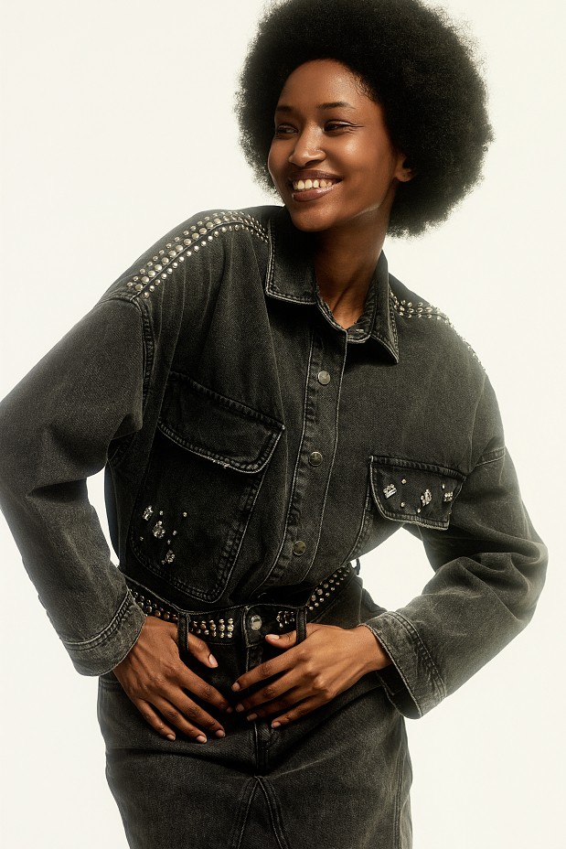 Denim overshirt, μακρυμάνικο, με γιακά, κλείσιμο με κουμπιά, με τσέπες, με τρουκς και στρας, άνετη εφαρμογή, βαμβακερό