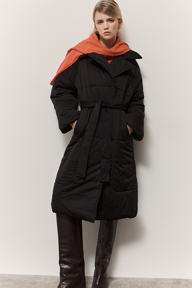 Μακρύ μπουφάν, με γιακά και πέτο, δέσιμο με ασορτί ζώνη, μακρυμάνικο, με τσέπες, κανονική εφαρμογή