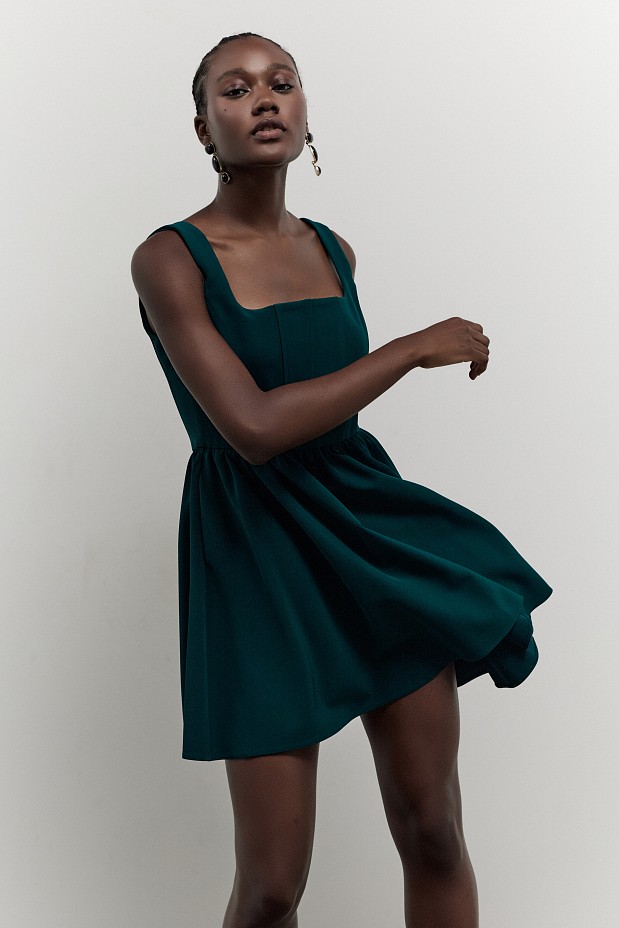 Μίνι φόρεμα, αμάνικο, με τετράγωνη λαιμόκοψη, με μπούστο κορσέ, με πιέτες, κλείσιμο με φερμουάρ, Α γραμμή