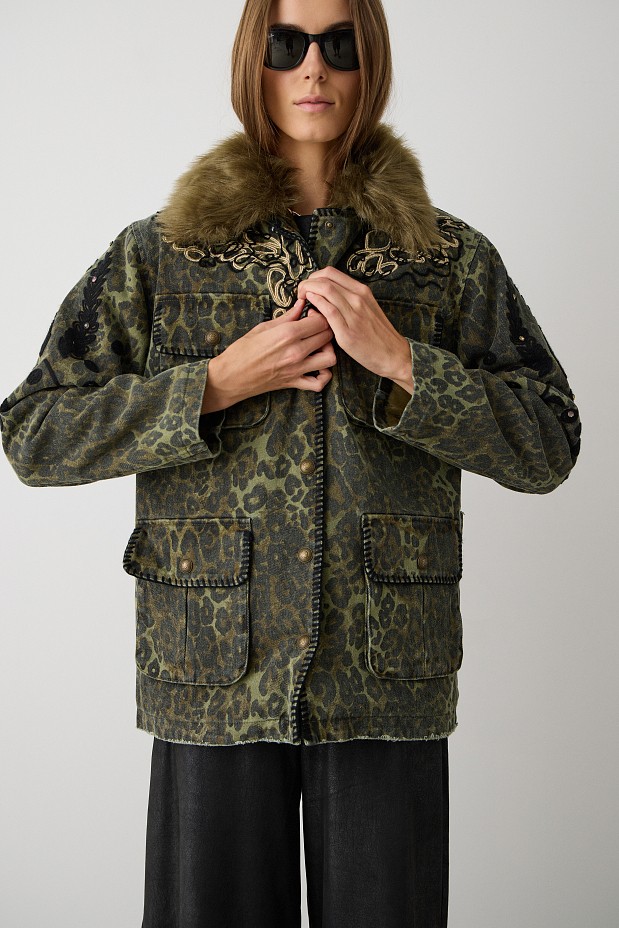Denim μπουφάν με κέντημα, με αποσπώμενη ψεύτικη γούνα στο γιακά, κλείσιμο με κουμπιά, με τσέπες, με στρας, εσωτερική επένδυση, κανονική εφαρμογή, leopard