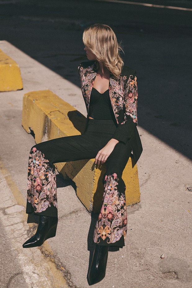 Εμπριμέ παντελόνι, με καμπάνα, κλείσιμο με φερμουάρ στο πλάι, κανονική εφαρμογή