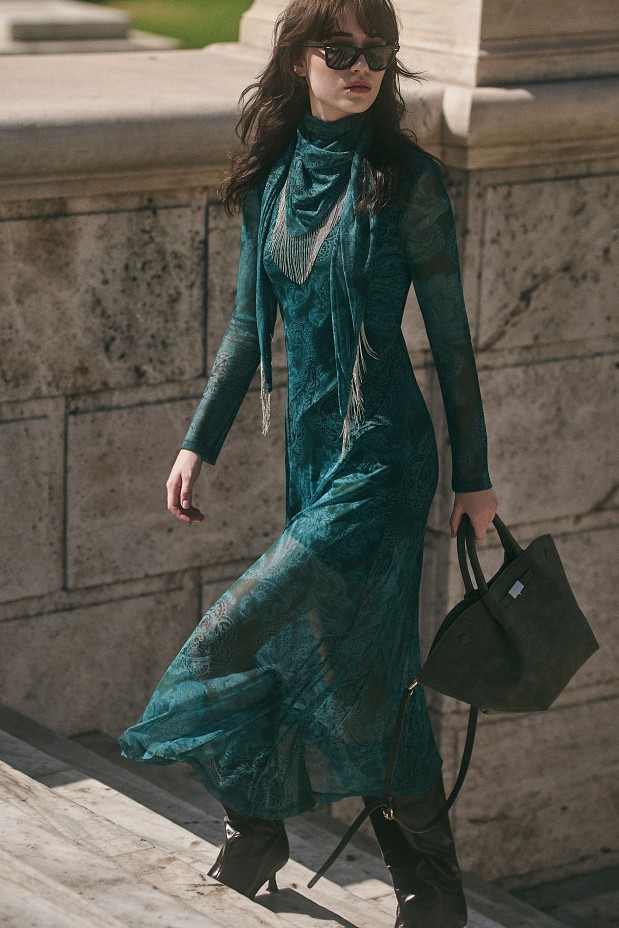 Μάξι εμπριμέ φόρεμα, μακρυμάνικο, με στρογγυλή λαιμόκοψη, με αποσπώμενο φουλάρι με στρας, ημιδιάφανο, με μεσοφόρι, κανονική εφαρμογή, ελαστικό