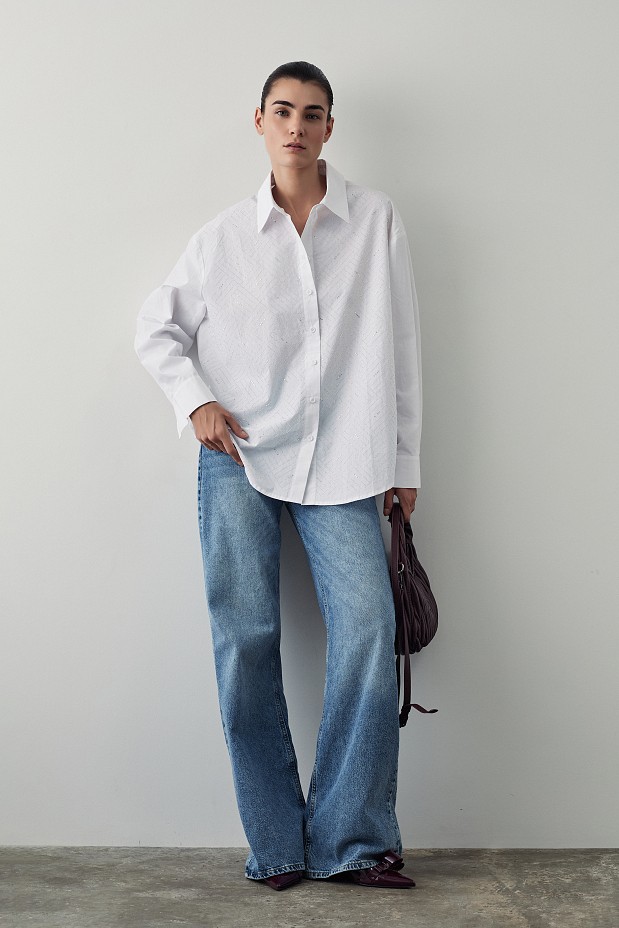 Shirt, with long sleeves, with collar, button closure, with rhinestones, loose fit, cotton