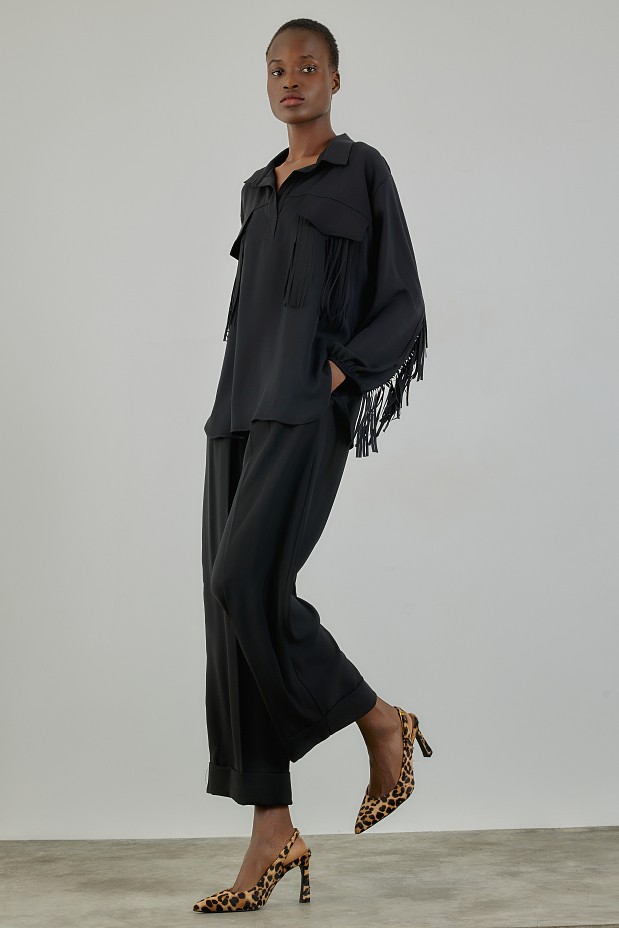 Blouse with long sleeves, with collar, V neckline, with pockets, fringed, regular fit