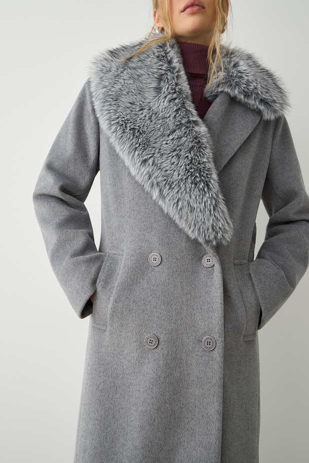 Longline coat, with long sleeves, button closure, with furry collar, regular fit, soft texture