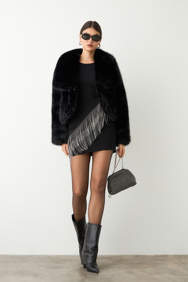 Mini dress, sleeveless, with round neckline, zip fastening on the back, with applique chains, bodycon