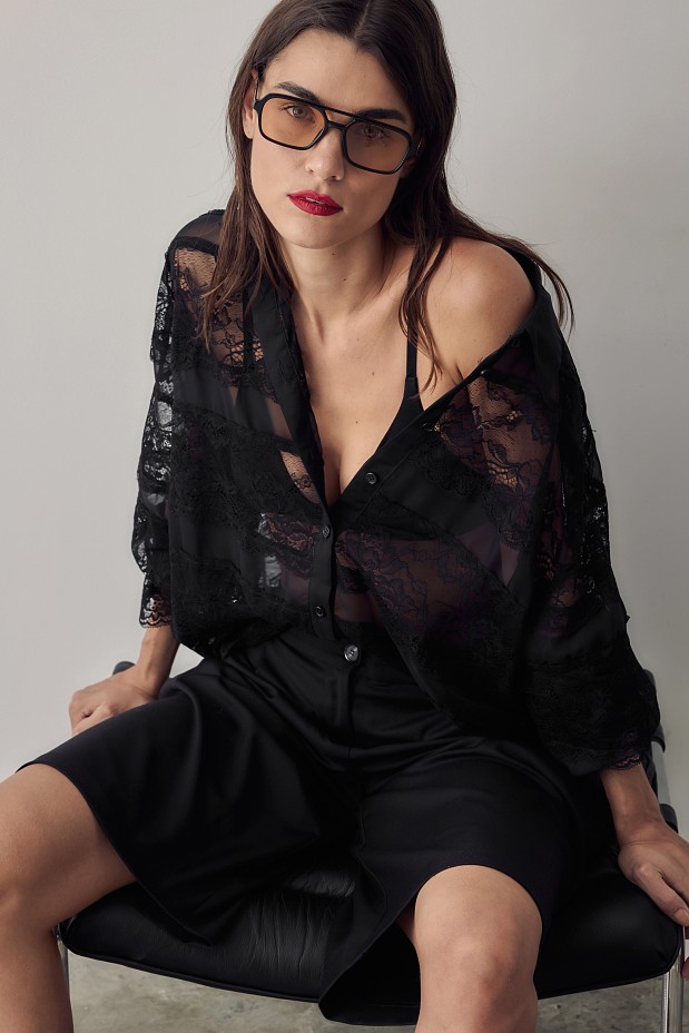 Semi sheer shirt, with long sleeves, with lace, with collar, button closure, with elasticated cuffs, regular fit