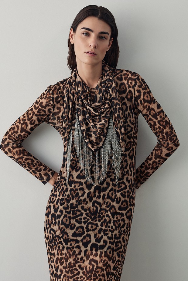 Maxi dress, with long sleeves, leopard print, round neckline, semi-sheer, with detachable scarf with rhinestones, with inner lining, bodycon