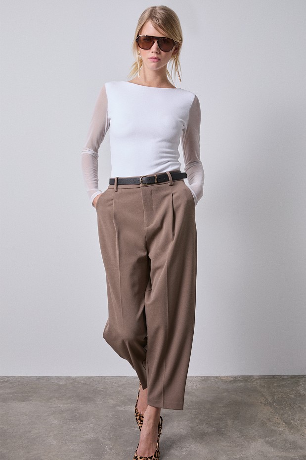 Barrel trousers, with detachable belt, button closure and zip fastening, with pockets, with pleats, regular fit
