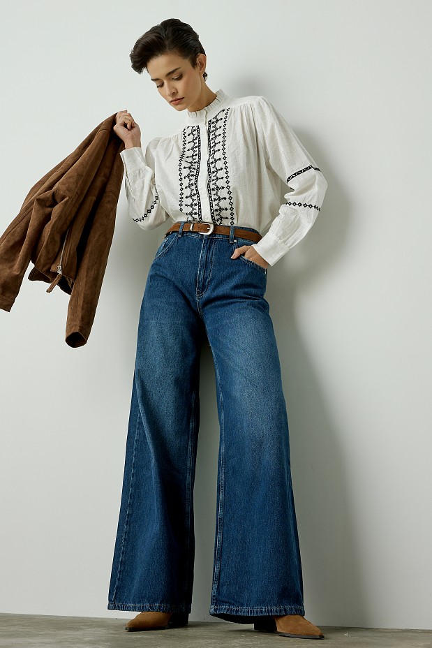 Embroidered shirt, with long sleeves, button closure, with ruffles on the collar, with lurex details, regular fit, cotton