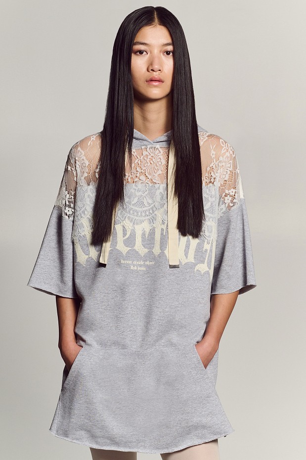Mini dress, with short sleeves, sweatshirt, with hoodie, with lace, with print, with pockets, cotton, regular fit