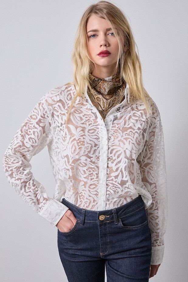 Semi sheer shirt, with lace, with long sleeves, with collar, button closure, regular fit