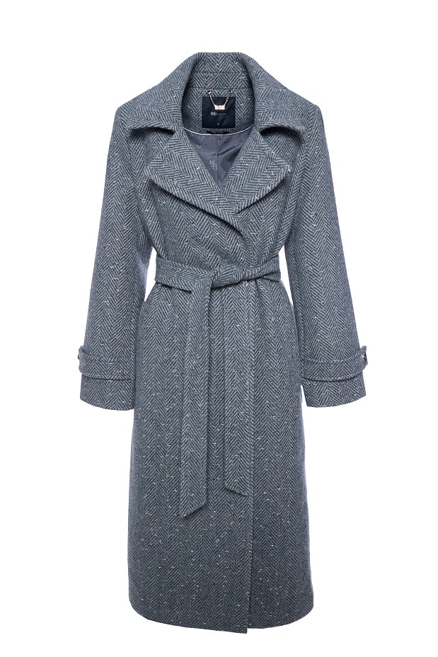 Abrigo largo con mangas largas, cuello solapa, cierre con botones y cinturón, punto espiga, tejido lurex, diseño lurex