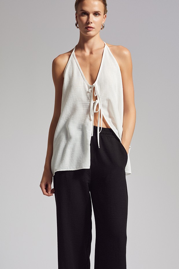 Blusa con lazos delanteros, cierre de lazo trasero en el cuello, diseño recto