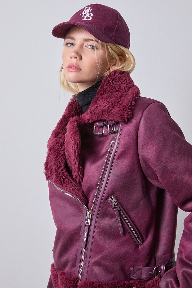 Cazadora efecto piel, con interior de pelo sintético, mangas largas, cuello y cierre con correa, cremallera, bolsillos, diseño recto