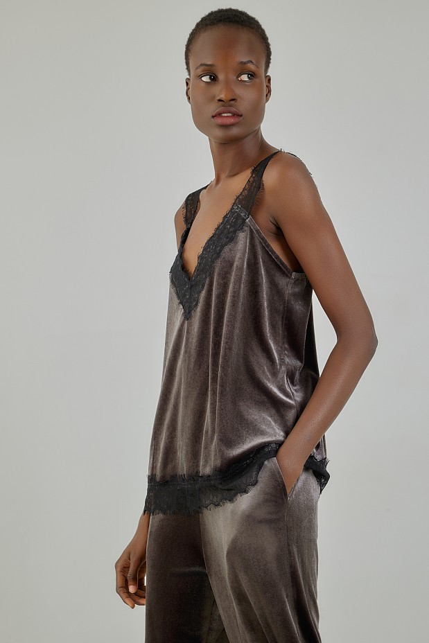 Top sin mangas, con escote pico, encaje, terciopelo al tacto, diseño recto