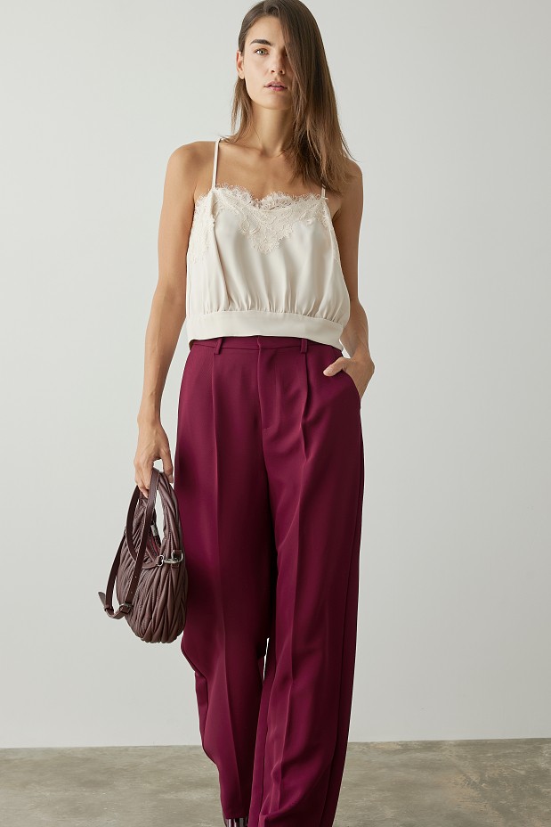 Pantaloni drepți, cu pliuri, închidere cu fermoar și clemă, cu buzunare, talie înaltă, croială clasică